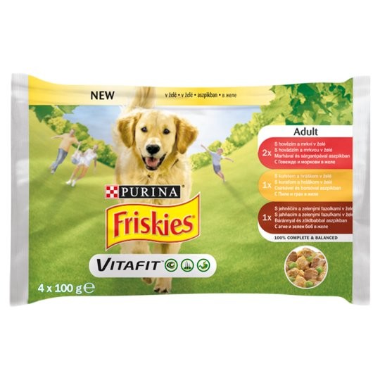 Purina Hrana Umeda Pentru Caini, Friskies Vitafit Adult, Vita/Pui/Miel In Aspic, 4×100 g