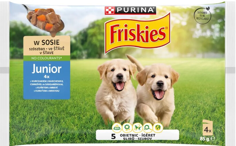 Purina Hrana Umeda Pentru Caini, Friskies Junior, cu Pui si Morcovi in Sos, 4×85 g