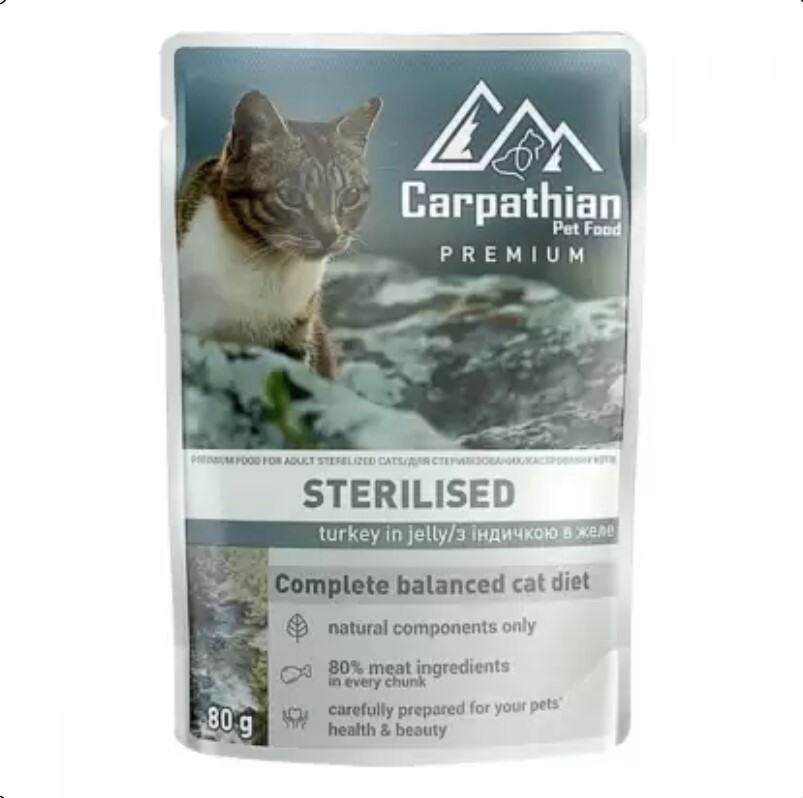 Carpathian Hrana Umeda Pentru Pisici, Premium Adult, Steril, Cu Curcan In Jeleu, 80 g