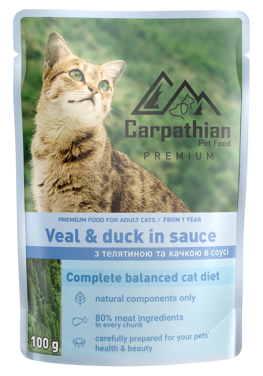 Carpathian Hrana Umeda Pentru Pisici, Premium Adult, Cu Vitel Si Rata In Sos, 100 g