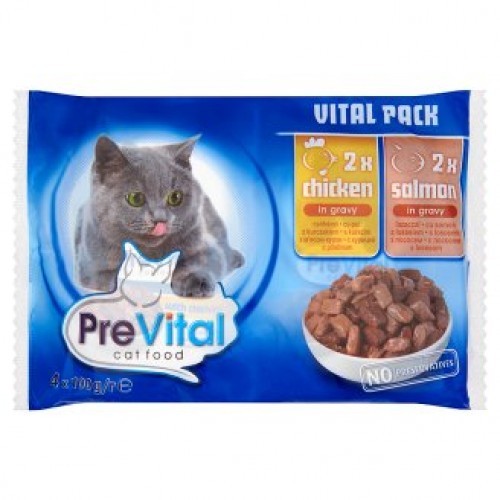 PreVital Hrana Umeda Pentru Pisici, Prevital Vital Pack, Cu Pui Si Somon In Sos, 4×100 g