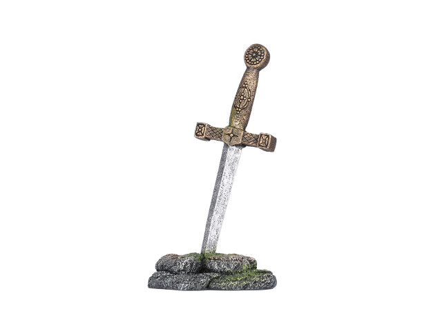 Sabia Excalibur. Acest ornament din polirasina este 100% non-toxic si ideal atat pentru acvariile cu apa sarata, cat si pentru apa dulce. Nu va afecta echilibrul biologic al pestilor. Culoarea se poate schimba in timp.