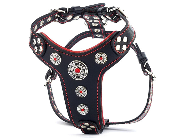 BESTIA CUSTOM DOG GEAR® prezinta cu mandrie; Hamul „Bijou” este la fel de unic ca si cainele tau. Dispune de 2 nituri rotunde din argint vechi cu strasuri montate rosii. Acest ham este realizat complet manual. Are o perna moale din spuma si piele rosie montata pe placa pieptului pentru a-l face super confortabil pentru animalul dvs. de companie. Toate piesele metalice și niturile sunt placate cu nichel de culoare argintie. Culoare primară: Negru Cataramele au latimea de 18 mm (0,7 inchi), iar inelul D are o latime de 25 mm (1 inch). Tabel cu marimi: Marimea S: Acest ham se potriveste la o dimensiune a pieptului de: 40 cm (15,7 inchi) pana la 73 cm (28,7 inchi) si o circumferinta inferioara a pieptului de 25 (9,8 inchi) la 48 cm (18,9 inchi) Marimea M: se potriveste tuturor raselor de marime medie, incepand de la o dimensiune a pieptului de: 19,7 inchi (50 cm), potrivindu-se pana la o dimensiune a pieptului de 29,5 inchi (75 cm) si o circumferinta inferioara a gatului de 13,8 pana la 22,8 inci (35 pana la 58 cm). Cadoul perfect pentru cainele tau de talie mica sau medie, cum ar fi: pug, buldog, buldog francez, bull terrier, Jack Russel etc. -100% piele naturala – captuseala moale -calitate lucrata manual -fabricat in Europa -design unic
