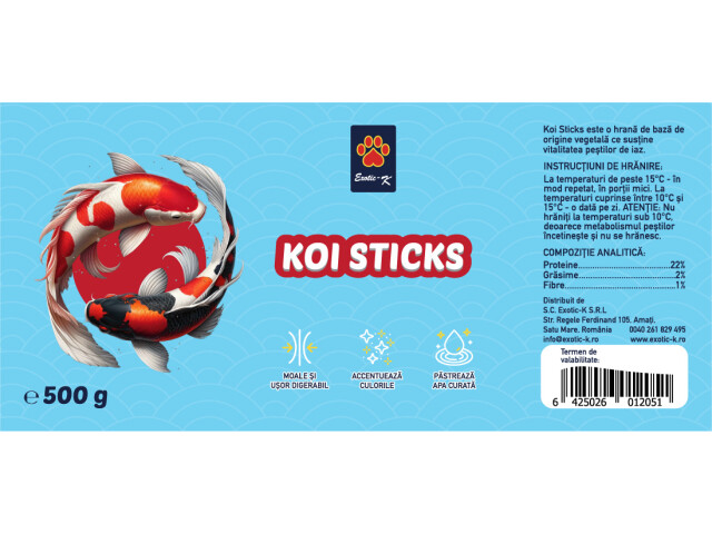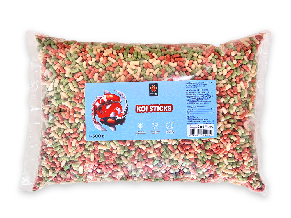 Koi Sticks este o hrană de bazã de origine vegetala ce sustine vitalitatea pestilor de iaz. INSTRUCTIUNI DE HRĂNIRE: La temperaturi de peste 15°C -în mod repetat, in portii mici. La temperaturi cuprinse între 10°C si 15°C – o dată pe zi. ATENTlE: Nu hrăniti la temperaturi sub 10°C, deoarece metabolismul lor Încetineste si nu se hrănesc. COMPOZITIE ANALITICA: Proteine..22% Grăsime…2% Fibre.. 1% Beneficiile hranei pentru pesti Koi sticks: Moale si usor digerabil: Hrana este conceputa pentru a fi moale si usor de digerat pentru pestii koi, asigurand o absorbtie eficienta a nutrientilor. Acest lucru contribuie la mentinerea sanatatii generale a pestilor si reduce riscul problemelor digestive. Accentueaza culorile: Hrana contine ingrediente care ajuta la intensificarea si evidentiera culorilor vibrante ale pestilor koi. Acest aspect este important pentru mentinerea aspectului estetic si a vitalitatii generale a pestilor. Pastreaza apa curata: Formula hranei este conceputa pentru a minimiza deseurile si a reduce poluarea apei. Acest lucru ajuta la mentinerea apei clare si curate in iaz, esentiala pentru sanatatea pestilor si a ecosistemului iazului in ansamblu. Aceste beneficii contribuie la bunastarea pestilor koi, asigurand ca raman sanatosi, colorati si traiesc intr-un mediu curat.
