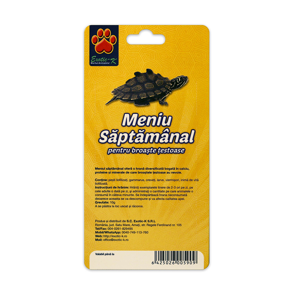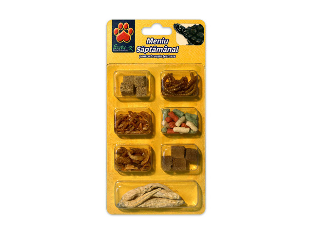 Meniul saptamanal ofera o hrana diversificata bogata in calciu, proteine si minerale de care broastele testoase au nevoie. Contine: pesti liofilizati, gammarus, creveti, larve, viermisori, inima de vita liofilizata. Instructiuni de hranire: Hraniti exemplarele tinere de 2-3 ori pe zi, pe cele adulte o data pe zi, si administrati o cantitate pe care animalele o consuma in cateva minunte. Se indeparteaza hrana neconsumata deoarece aceasta se va descompune si va afecta calitatea apei. Greutate: 10g A se pastra la loc uscat si racoros.