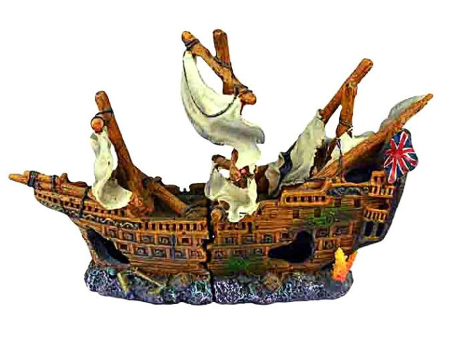 Decoratiune din rasina (poliester) – nava naufragiata Poate imbogati orice aranjament creand o atmosfera naturala in acvariu. Ofera adapost pestilor fiind si o ascunzatoare perfecta.