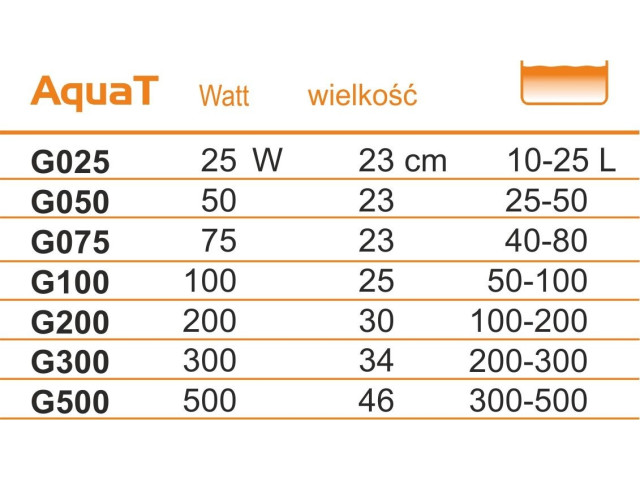 Incalzitor AquaT 100W cu termostat AquaT foloseste un sistem simplu si lizibil de control al temperaturii – datorita folosirii unui buton, deasupra incalzitorului, puteti seta temperatura dorita, care va fi controlata de un termostat. Incalzitorul este echipat cu un diod de control care informeaza despre situatia actuala. Si asta e tot! Datorita simplitatii operatiunii, puteti asigura timp si energie, astfel incat sa puteti fi linistit cu privire la protectia acvariului. -excelent pentru incepatori – operarea simpla si sistemul de control al temperaturii lizibil il fac atat de usor de utilizat! -asamblare simpla – nu trebuie sa va pierdeti timpul ezitand – incalzitorul nostru este echipat cu ventuze pentru a se monta pe acvariu -se potriveste rezervorului dvs. de apa – incalzitorul AquaT vine in mai multe dimensiuni, astfel incat sa puteti alege exact ceea ce aveti nevoie Pentru a asigura functionarea corecta a incalzitorului, plasati-l langa un filtru care distribuie apa incalzita. Incalzitorul se potriveste acvariilor cu o capacitate de 50L – 100L, daca rezervorul dvs. de apa este diferit, va rugam sa verificati si alte variante de AquaT. Putere: 100 W Dimensiune: 25 cm Dimensiunea acvariului: 50-100 L Mod de utilizare: Puneti incalzitorul in apa si fixati-l pe peretele din apropierea iesirii de apa a filtrului Cu ajutorul unui buton plasat deasupra incalzitorului, alegeti temperatura potrivita La fiecare 15 minute va rugam sa verificati temperatura apei pana cand atinge valoarea dorita Daca este necesar, corectati valoarea temperaturii cu scala amplasata pe incalzitor Avertizare! Temperatura setata pe incalzitor poate fi usor diferita de cea reala, indicata de termometru. In cazul oricaror discrepante, va rugam sa corectati temperatura si sa o controlati cu termometrul.