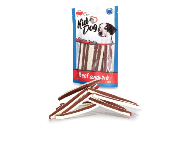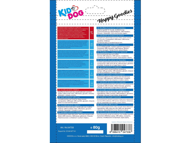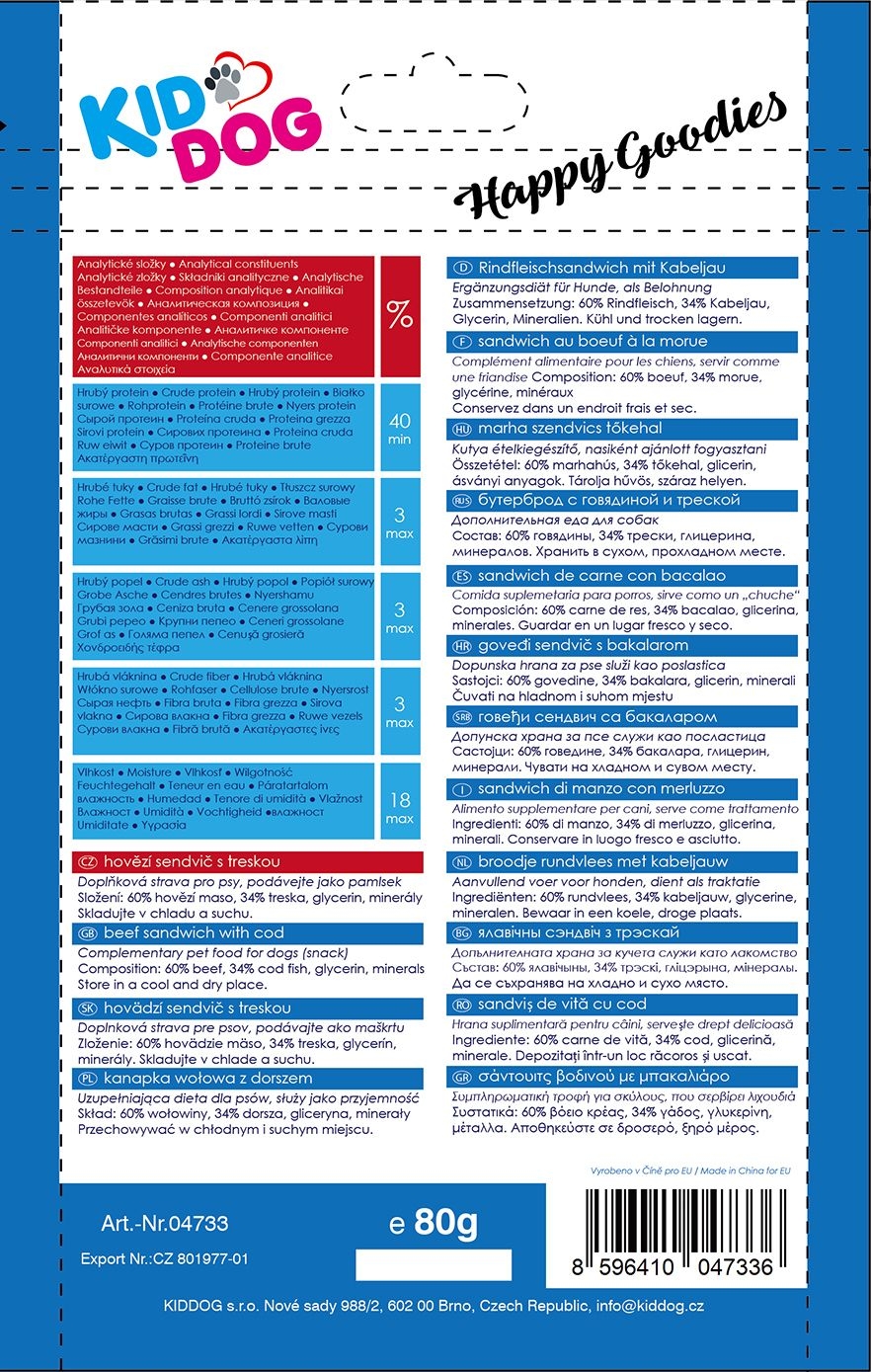 Hrana complementara pentru caini Compozitie: 60 % carne de vita, 34 % cod, glicerina, minerale Greutate: 80 g