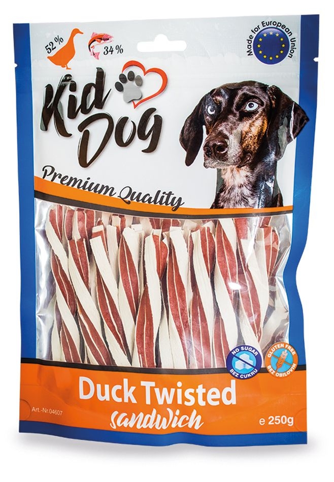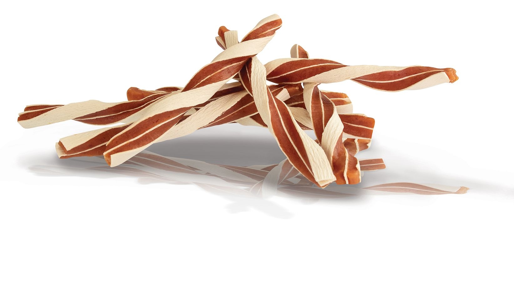 Gustare motivationala sau recompensa Poate fi usor taiat in bucati mai mici Aroma si gust atragator Compozitie: carne de rata 52%, cod 34% glicerina, proteine vegetale, sorbitol Greutate: 250 g