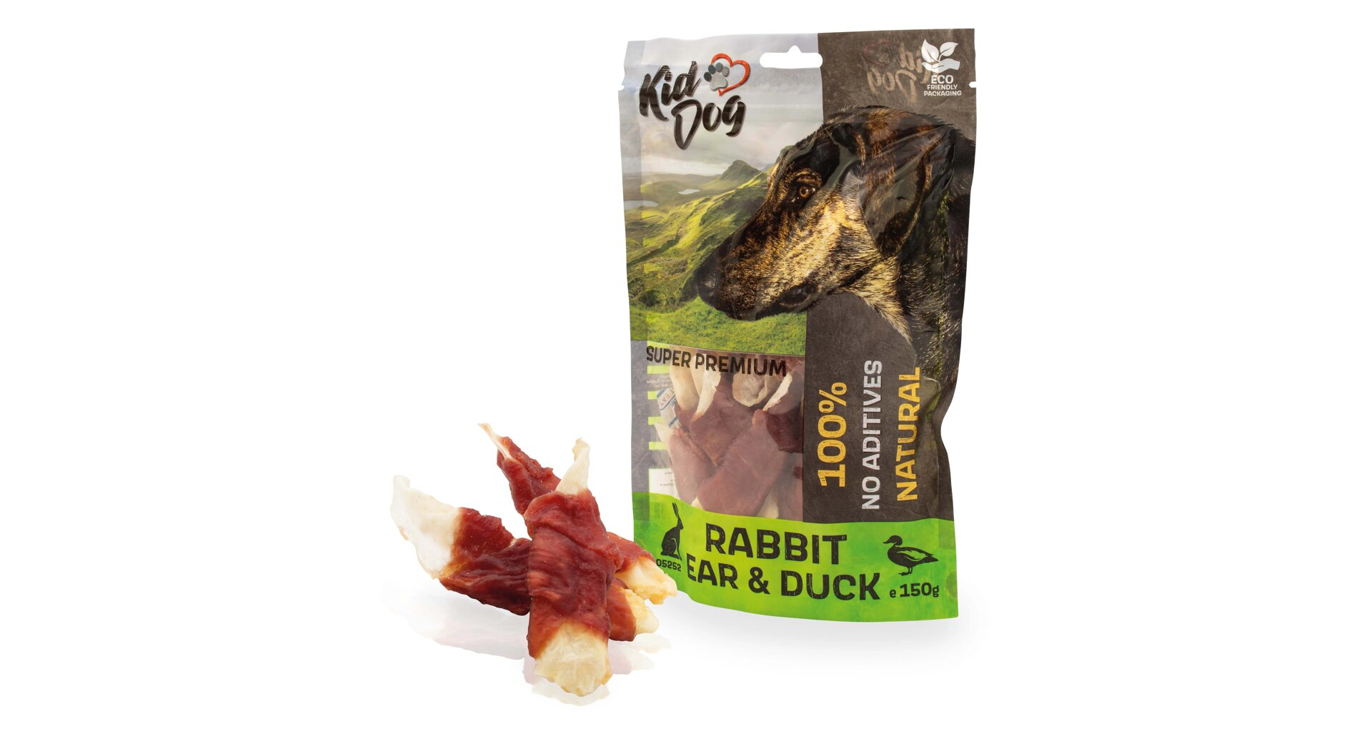 KIDDOG Super Premium – Piept de rata pe ureche de iepure 100 % natural, 150 g Compozitie & valori nutritionale Ingrediente: 45 % carne de iepure + 55 % piept de rata Gramaj: 150 g per pachet (aprox. o bucata de cca 10 cm) Fara cereale, fara zahar – ideal si pentru cainii sensibili la alergeni