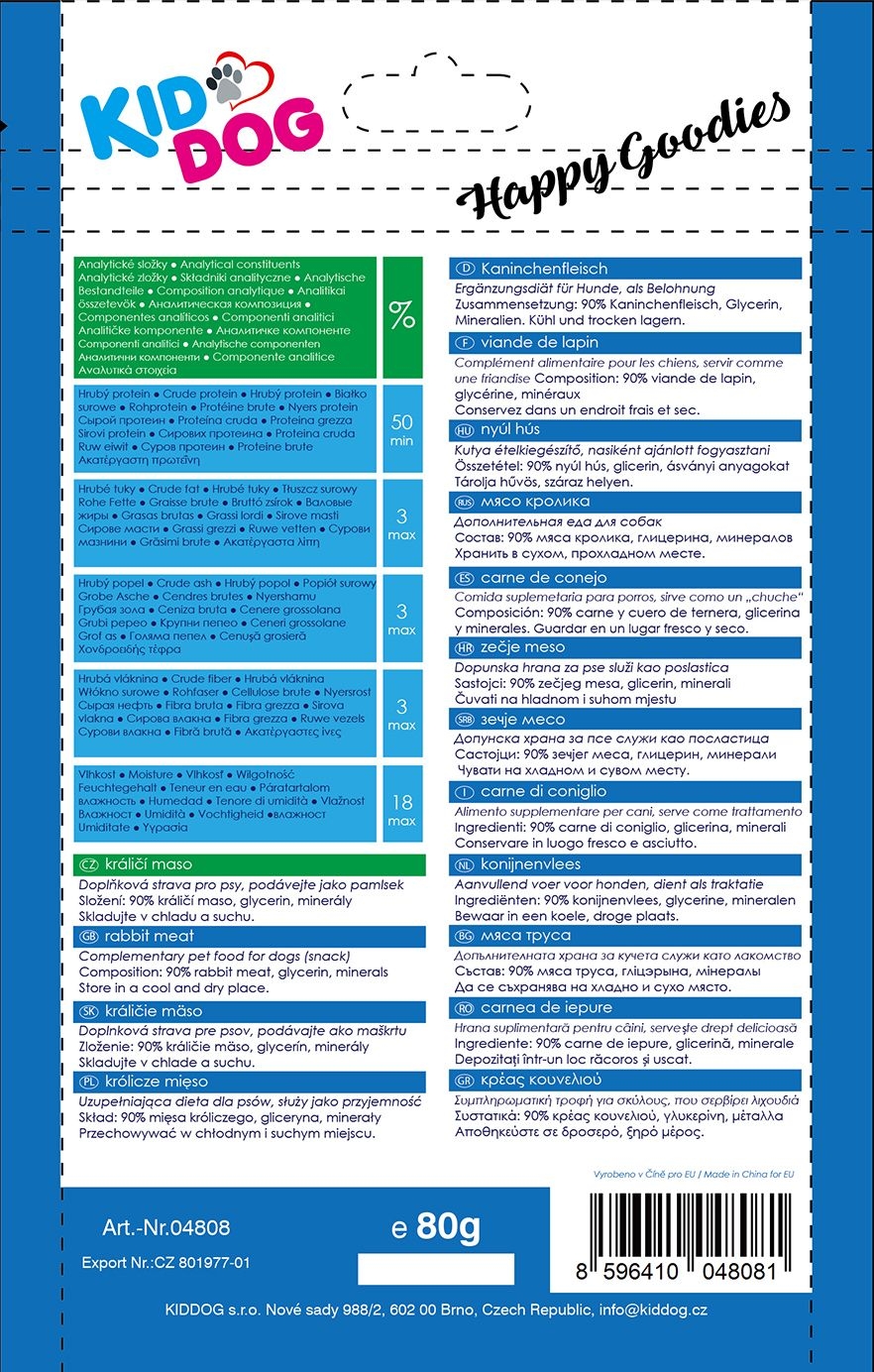 Hrana complementara pentru caini O recompensa gustoasa Calitate premium Fara cereale si zahar Compozitie: 90 % carne de iepure, glicerina, minerale, sorbitol Greutate: 80 g