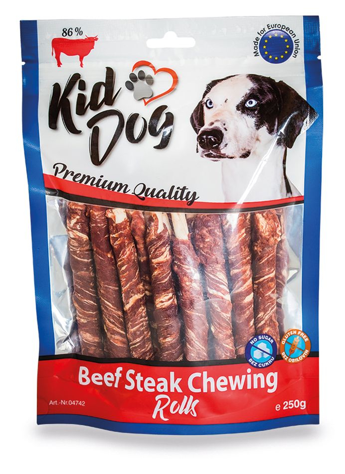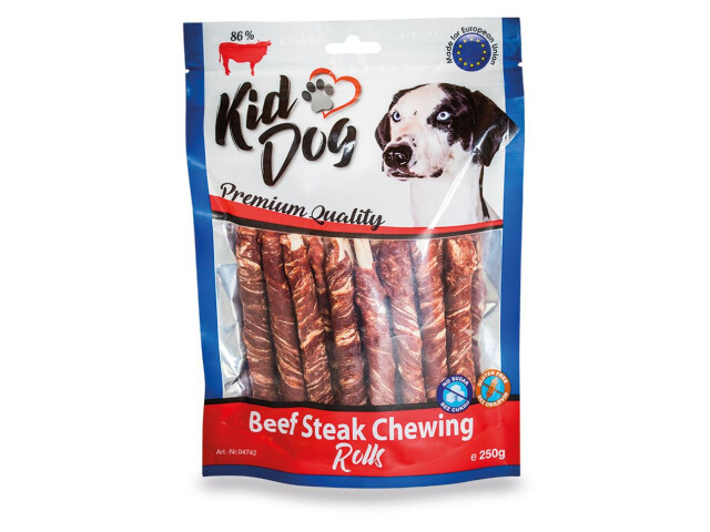 Friptura de vita KIDDOG pe baton de bivol – 8 mm/12 cm 250 g Piele bruta groasa acoperita cu carne de vita Recompensa motivationala pentru orice activitate Dimensiune: 8 mm/ 12 cm Cantitate: 250 g