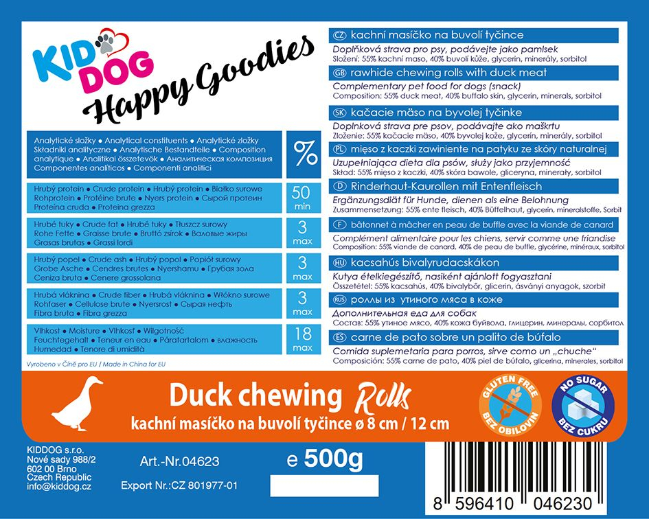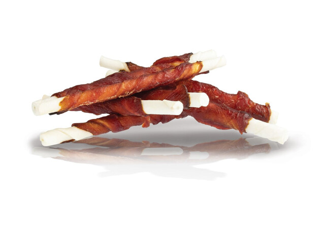 Carne de rață pe băț de bivol – 8 mm/12 cm 500 g. Aromă și gust atrăgător. Recompensă motivațională. Batonul de piele de bivol curăță mecanic dinții. Compozitie: carne de rata 55%, piele de bivol 40% glicerina, minerale. Greutate: 500 g.
