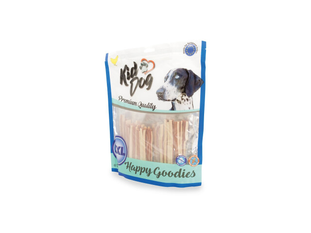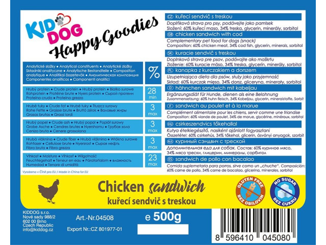 Sandwich de pui KidDog cu Cod 500 g Gustare motivationala sau recompensa Poate fi usor taiat in bucati mai mici Aroma si gust atragator Compozitie: pui 60 %, cod 34 %, glicerina, minerale Greutate: 500 g