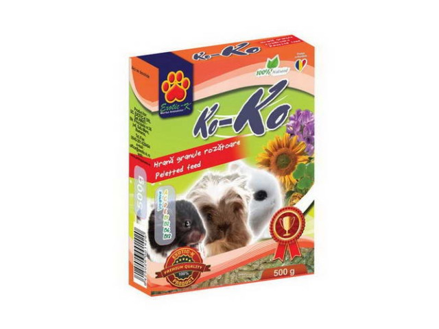 Granulele KO-KO contin toate substantele nutritive esentiale necesare pentru toate tipurile de rozatoare (hamsteri, cobai, iepuri, etc), care datorita formei si compozitiei sale naturale asigura dezvoltarea cea mai adecvata a acestor animale.