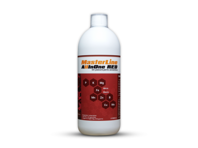 Descriere scurta • Formula fara nitrat • Contribuie la cea mai puternica pigmentare a plantelor rosii • Dozare mai facila dintr-un singur flacon • Dozare zilnica sau saptamanala • Plantele au un ritm lent de crestere • Contine pahar dozator gradat de la 2.5 la 20 ml Beneficii • Fertilizant pentru plantele ornamentale de acvariu, ce contine toti micro si macro nutrientii, dar fara nitrat • Ofera cea mai puternica pigmentare a plantelor rosii si un ritm lent de crestere • Potrivit pentru acvarii de concurs si acvarii cu multe vietati • Determina plantele sa se hraneasca cu nitratul din substrat si cu cel produs de vietati • Compatibil cu toate formele de viata acvatica, inclusiv creveti • Potrivit pentru dozare zilnica sau saptamanala • Un singur flacon, un dozaj facil, o investitie minima Recomandari • Foloseste-l doar in acvarii cu multe vietati sau in acvarii cu substrat bogat in nutrienti: aquasoil sau substrat imbogatit cu MasterLine Root Caps • Dupa ce s-a epuizat nitratul din substrat si apa, dozeaza separat acest element • Pentru mai bune rezultate, foloseste-l impreuna cu MasterLine Carbo • Evita folosirea lampilor UV, iar daca chiar esti nevoit sa o faci, dozeaza 2 ml la 30 litri zilnic • Dupa un schimb de apa mai mare de 50%, adauga doza tripla • Nu contamina solutia cu apa din acvariu • Nu ingera si nu lasa la indemana copiilor si a animalelor de companie • Depoziteaza la temperatura camerei. Protejeaza de lumina, caldura si inghet • Numai pentru utilizare in acvarii Volum: 200, 500, 1000, 5000 ml Continut MasterLine All In One Red contine toate elementele nutritive necesare plantelor (dar fara nitrat), intrun singur flacon: 0.1% P , 3.6% K, 0.3% Mg, 0.12% Fe, 0.036% Mn, 0.023% Zn, 0.021% B, 0.005% Cu, 0.003% Mo Dozaj Zilnic: 1 ml / 30 L 1 ml / 30 L = 0.1 ppm PO4, 1.2 ppm K, 0.1 ppm Mg, 0.04 ppm Fe