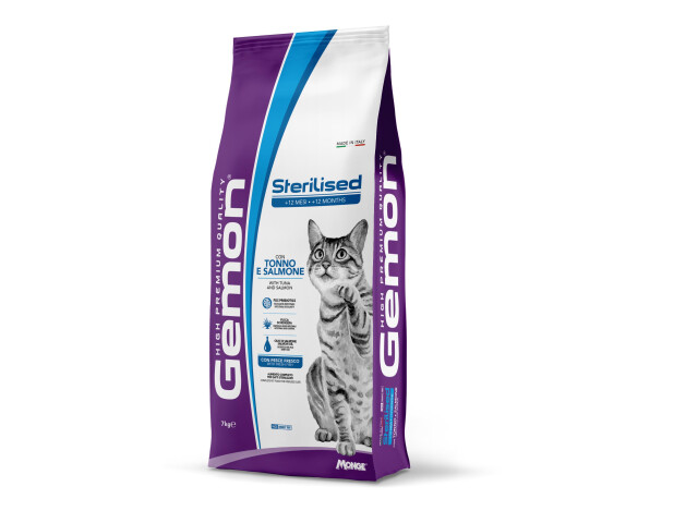 Gemon Cat Steril cu Ton si Somon este o hrana completa pentru pisici adulte sterilizate. Formularea se caracterizeaza prin ingrediente de calitate, cum ar fi tonul si somonul, surse de nutrienti esentiali, si orezul, o sursa de carbohidrati, gatit si facut foarte digerabil prin procesul de extrudare. O dieta ideala pentru pisici sterilizate cu prebiotice, fructo-oligozaharide (FOS) si mananoligozaharide (MOS), pentru a sustine bunastarea intestinala si pulpa de sfecla pentru a ajuta la mentinerea greutatii corporale ideale. Contine peste proaspat pentru o palatabilitate optima si ulei de somon pentru stralucire si catifelare a blanii. Fara adaugare de coloranti artificiali si conservanti.
