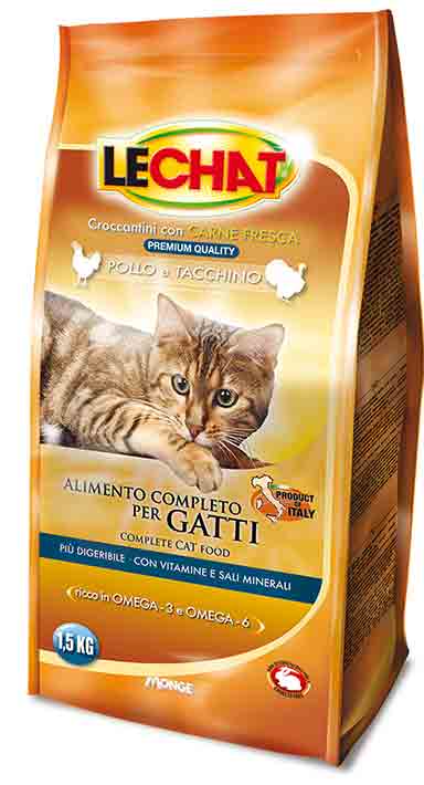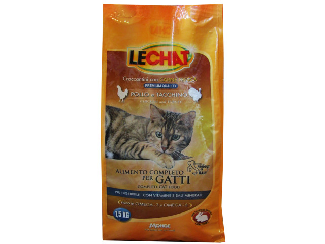 Monge LeChat Croccantini cu pui si curcan de 1,5 kg. Hrana completa pentru pisici adulte. Bogat in Omega-3 si Omega-6. Hrana completa, conceputa pentru a atrage chiar si pisicile cu gusturi dificile. Este produsa cu pui si curcan de o calitate excelenta, carne bogata in proteine de valoare biologica ridicata, echilibrata in aminoacizii esentiali. Datorita continutului ridicat de taurina si vitamina A, aceasta ajuta la mentinerea capacitatii vizuale a pisicii dvs. Continutul scazut de magneziu si un pH neutru impiedica formarea de pietre la rinichi. Raportul optim dintre acizii Omega-3 si Omega-6 acizi grasi esentiali care sunt implicate in stari inflamatorii, asigura, de asemenea, un suport valid pentru a contracara reactiile alergice. Raportul corect de calciu / fosfor asigura o dezvoltare armonioasa scheletica si dentara. COMPOZITIE – Cereale, carne si produse din carne (pui min 5%, curcan proaspat min 5%..), Uleiuri si grasimi (ulei de somon 0,5%), legume, peste si produse secundare, minerale, drojdie (mannan – oligozaharide MOS 500 mg / kg), FOS Fructoligozaharide 500 mg / kg, Yucca Schidigera 1000 mg / kg.