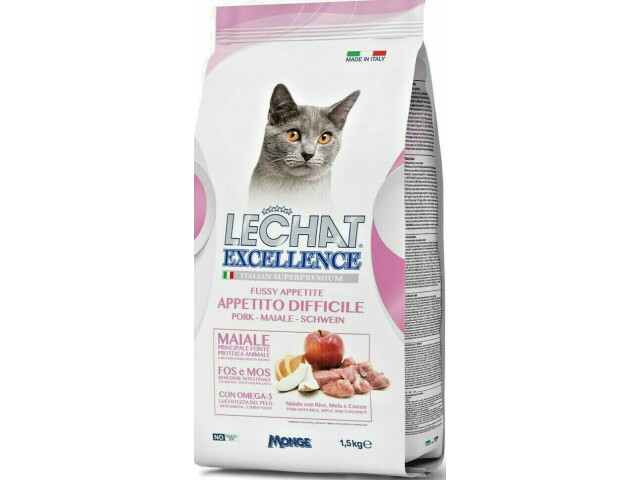 LeChat Excellence Difficult Appetite Cu Carne De Porc este o hrana completa pentru pisicile adulte cu pofta dificila de orez, mar si nuca de cocos. Le Chat Excellence este linia de produse conceputa pentru a oferi pisicii tale numai ce este mai bun. O dieta completa formulata cu ingrediente care garanteaza in fiecare zi bunastarea prietenilor nostri patruped. Formulari cu materii prime de calitate precum ouale si carnea de porc, surse de proteine foarte gustoase, cu valoare biologica ridicata, utile pentru pisicile cu pofta dificila. Formulat cu pulpa de mere si prebiotice (MOS si FOS), surse de fibre solubile pentru a sustine regularitatea fiziologica a tractului intestinal. Contine si ulei de somon, o sursa de acizi grasi omega-3, pentru stralucirea blanii si pulpa de cocos uscata. Fara adaugare de coloranti artificiali si conservanti.Carne de porc (20% deshidratata si 8,5% carne proaspata), orez (15%), porumb, grasime animala (99,5% ulei de pui purificat), gluten de porumb, peste deshidratat (somon), proteine animale hidrolizate (ficat), ulei de somon (1). %, 99,5% purificata), drojdie de bere, oua intregi uscate (1%), pulpa de mar uscata (1%), produse din drojdie (manan-oligo-zaharide M.O.S. 1%), fructooligozaharide (F.O.S 0,75%), substante minerale , pulpa de cocos uscata (0,5%), yucca schidigera.