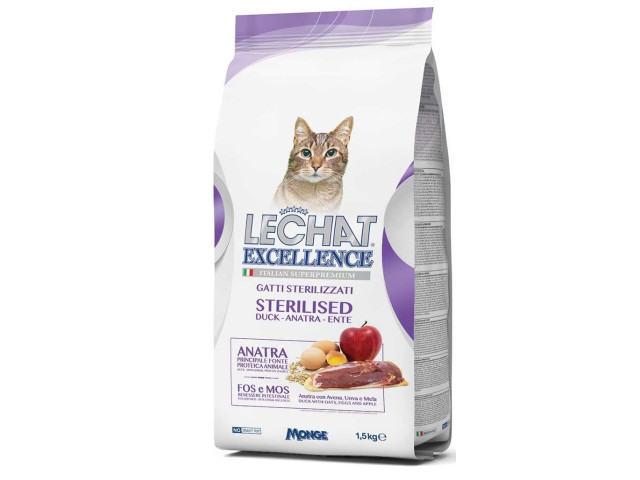 LeChat Excellence Sterilized Duck este o hrana completa pentru pisici adulte sterilizate, cu ovaz, oua si mar. O dieta completa formulata cu ingrediente care garanteaza in fiecare zi bunastarea prietenilor nostri patruped. Ingredientele de cea mai inalta calitate, precum RATA si OVAZ, promoveaza digestibilitatea si palatabilitatea; merele sunt o sursa de fibre si impreuna cu L-carnitina promoveaza controlul ideal al greutatii. Formulat cu prebiotice (FOS si MOS) pentru bunastarea intestinala. Fara coloranti artificiali si conservanti.Formulat cu prebiotice (FOS si MOS) pentru bunastarea intestinala.Fara coloranti artificiali si conservanti.Carne de rata deshidratata (26%), gluten de porumb, grau, ovaz (4%), proteine animale hidrolizate, grasimi animale (99,5% ulei de rata purificat), saruri minerale, oua intregi uscate (1%), pulpa de mere uscate (1). %), fructooligozaharide (0,4%), produse din drojdie (sursa de manan-oligozaharide M.O.S. 0,3%), Yucca schidigera.