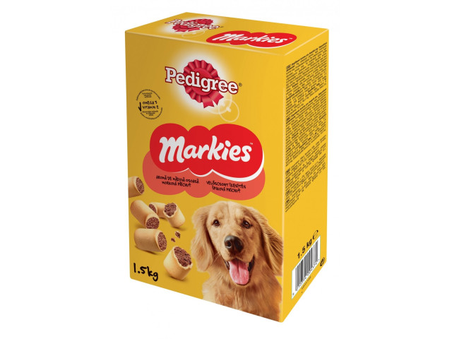 Biscuiti deliciosi, cu umplutura pe baza de maduva Biscuitii Markies sunt o surpriza pentru cainele tau: exteriorul este crocant, iar miezul este moale, din carne si maduva, un deliciu dublu. Contine: Omega 3 – pentru a fi in forma in fiecare zi Calciu – pentru dinti si oase puternice Vitamine si minerale – ajuta la mentinerea sistem imunitar Recomandari de hranire: – talie mica (<10kg) – pana la o bucata pe zi; - talie medie (10-25kg) – pana la 2 bucati pe zi; - talie mare (>25kg) – pana la 4 bucati pe zi.