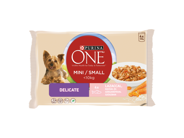 Hrana de inalta calitate in sos, foarte digerabila si special adaptata cavitatii mici a gurii unui caine. Micul tau caine pregateste o serie de retete noi delicioase, facute cu bucati delicioase de carne si legume. Hrana completa pentru caini adulti cu greutatea mai mica de 10 kg. Antioxidanti pentru un sistem imunitar sanatos. Este usor de digerat. Bucati mici si fragede de carne pentru gura mai mica. Ghid de hranire: Cantitatile zilnice recomandate trebuie ajustate in functie de vreme, de nivelul de activitate al cainelui si de conditia fizica. Apa proaspata si curata sa fie disponibila in mod constant. Cand utilizati PURINA ONE MINI pentru prima data, va recomandam o schimbare treptata prin amestecarea cantitatilor tot mai mari de PURINA ONE MINI cu hrana curenta a cainelui. ONE MINI DELICATE Hrana umeda pentru caini cu somon, orez si morcovi in sos Nutritie imbunatatita, adaptata nevoilor cainilor de talie mica. Cainele tau mic are nevoi nutritionale unice. Dezvoltat de expertii Purina, Purina ONE(r) MINI ofera o nutritie imbunatatita si de inalta calitate intr-un sos gustos. Retete gustoase, cu bucati mici si legume, astfel incat sa-ti poti hrani cainele cu o reteta special conceputa pentru a satisface nevoile sale nutritionale la fiecare masa. PURINA ONE MINI Delicate Snacks hrana umeda pentru caini in sos, mancare completa umeda pentru caini cu somon, orez si morcovi pentru caini adulti cu digestie sensibila. Pentru pielea sensibila Sustine functionarea sanatoasa a sistemului digestiv Muscaturi mici si moi pentru guri mai mici In pachete de 4x100g Instructiunile de utilizare Cantitatea zilnica recomandata de hranire poate varia in functie de nivelul de activitate al cainelui, conditia fizica si conditiile meteorologice. Adaugati intotdeauna apa proaspata si curata la mancare. Daca hraniti cainele dumneavoastra cu hrana Purina One pentru prima data, va recomandam sa treceti treptat la noua hrana amestecand hrana actuala cu cantitati tot mai mari de Purina One timp de 7 zile, pentru a permite sistemului digestiv al cainelui sa se adapteze la schimbare.