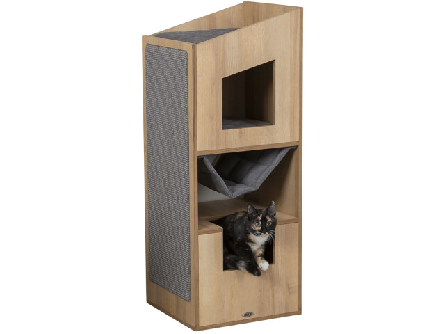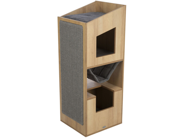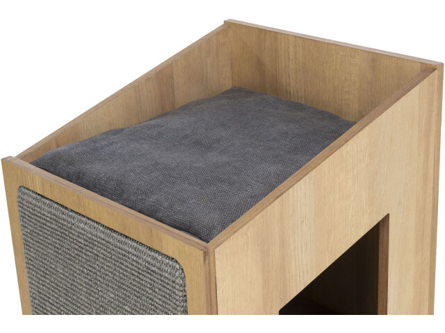 Informatii despre produs: -sisal/MDF, acoperit (aspect lemn) -pesteri cu perne reversibile (material tesut/poliester): spalare manuala -pat dragalas cu perna reversibila (material tesut/poliester): spalare manuala -cu hamac, matlasat -culoare: maro/gri Suprafata podea: 41 × 38 cm, Inaltime: 105 cm