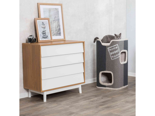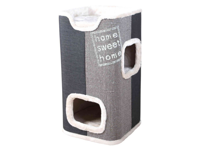 Ansamblu de joaca si de odihna pentru pisici. Material: tesatura / plus. Suprafete din sisal (poliester) pentru zgariere. Pestera complet echipata cu plus (poliester). Cu 2 etaje. Perna reversibila la fiecare nivel. Perna: lavabil la masina pana la 30 C / perna interioara: lavabil manual. Culoare: antracit / gri deschis / gri. Masuratori: 78 cm. Suprafata: 38×38 cm.