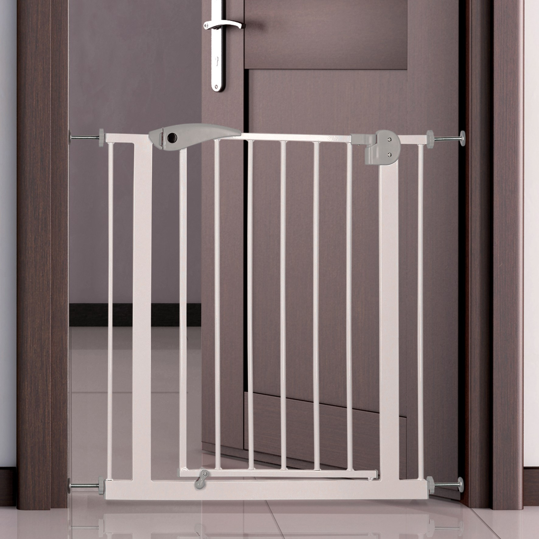 Bariera cu dispozitiv de prindere pentru o fixare usoara. Potrivita si pentru cainii de talie mare. Material:metal, lacuit. Se fixeaza fara insurubare sau gaurire. Usa metalica cu balamale se deschide pe ambele parti. Cu blocare de siguranta, poate fi actionata cu o singura mana. Poate fi extins dupa dorinta cu elemente disponibile separat (cu cate 10 cm fiecare): Articol 39452.