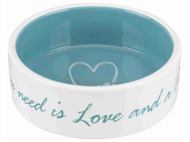 Acest castron ceramic pentru caini este perfect pentru a asigura hrana sau apa proaspata si curata pentru prietenul dumneavoastra patruped. Culoare: crem/petrol. Capacitate: 0.3 l Diametru: 12 cm