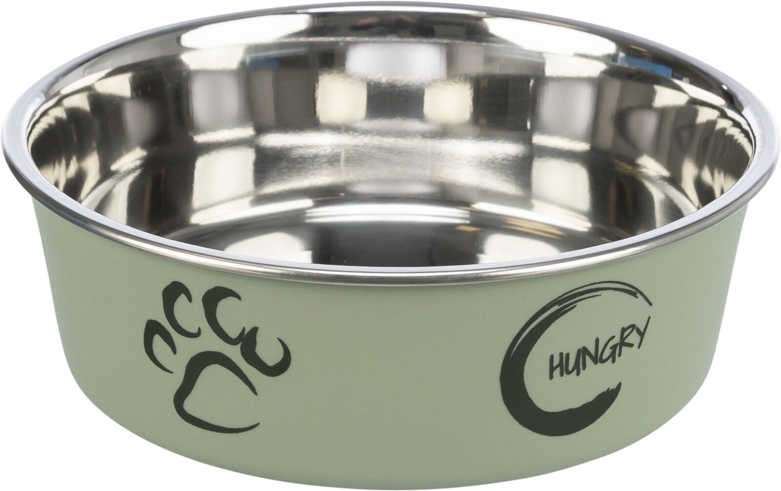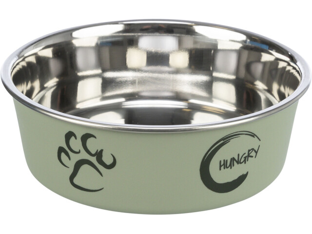 Castron din inox pentru apa sau hrana, potrivit pentru caini. Invelis exterior din plastic. Baza anti-alunecare datorita bazei din cauciuc. Masuratori: 0,3 l / ø 12 cm Capacitate: 0,3 l Diverse culori.Selectarea culorilor nu este posibila. Depinde de disponibilitatea stocului.