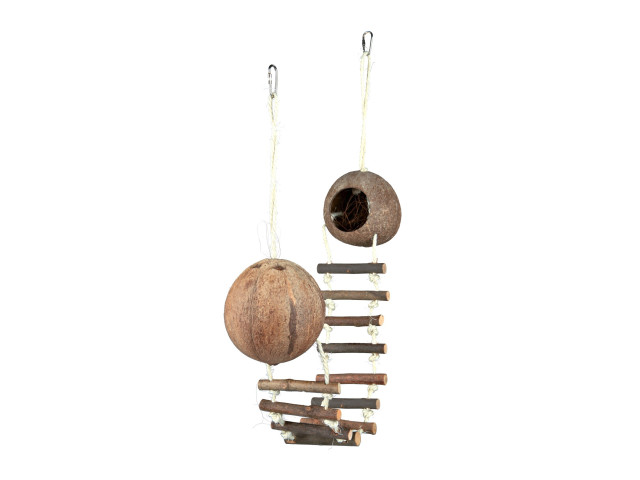 Casuta din nuca de cocos, cu pod. -fibre de cocos in interior. -pentru agatat. Masuri:13×100 cm. Versiune: dubla. de ex.: soareci, hamsteri.