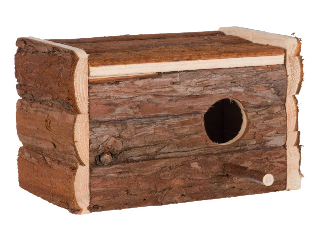 Cuib din lemn natural potrivit pentru pasari. Cu biban pentru aterizare. Cu racla in placa de baza pentru depunerea oualor. Capacul articulat faciliteaza curatarea. Dimensiuni: 21 × 12 × 13 cm de exemplu pentru: perusi Inaltime: 13 cm