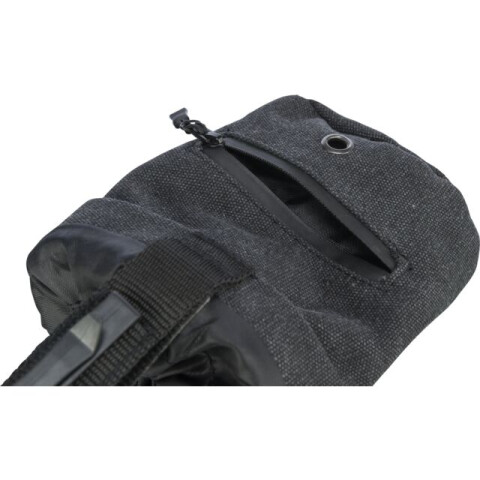 Poate fi inchis cu snur Dozator de saci igienice integrat Cu clema si bucla pentru atasarea la centura Aspect panza (poliester)