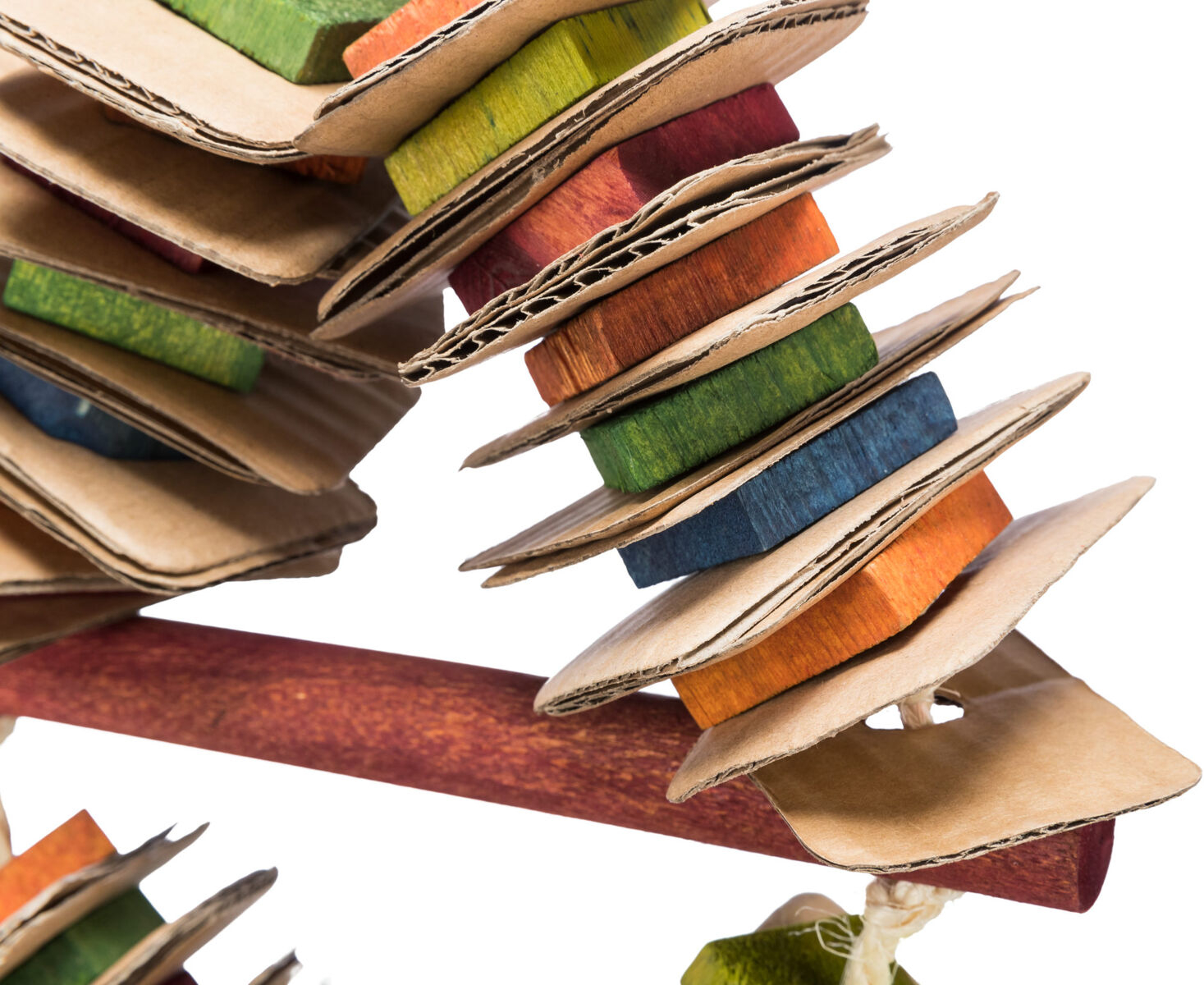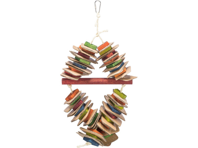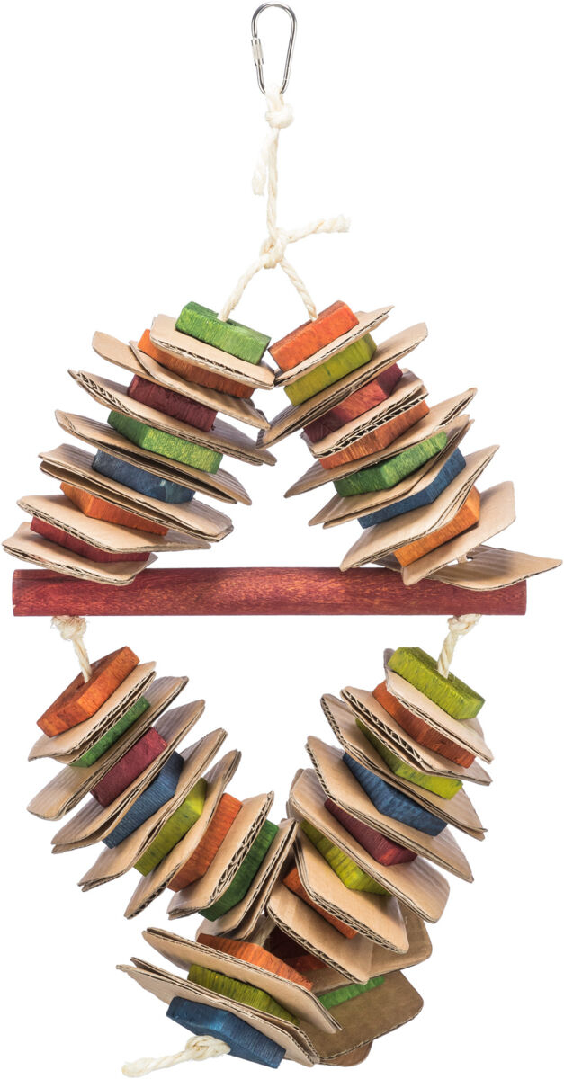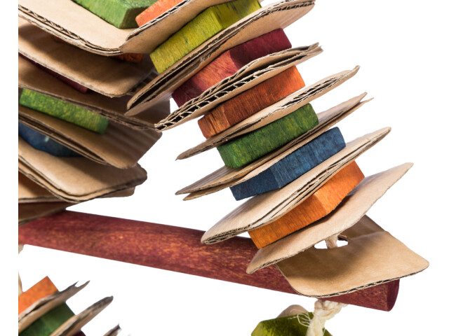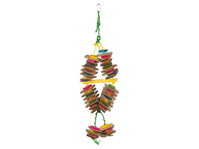 Jucarie din lemn, colorata, pe o franghie de sisal. Potrivita pentru pasari ca de exemplu: papagali. Material: carton si blocuri de lemn. Recomandat de World Bird Park Walsrode.