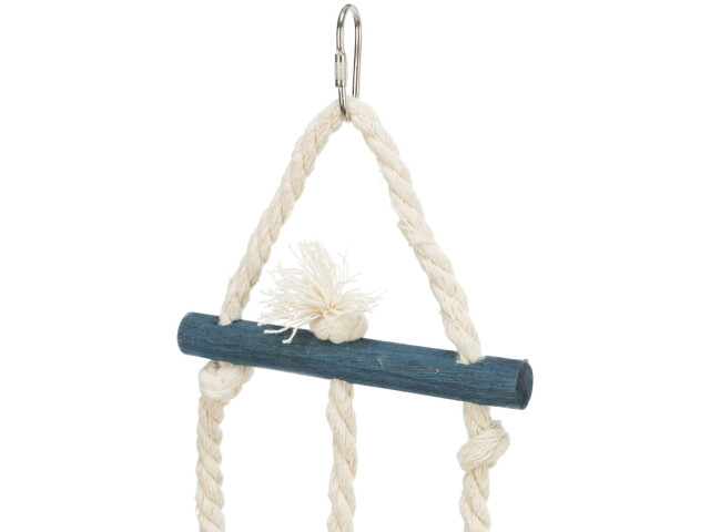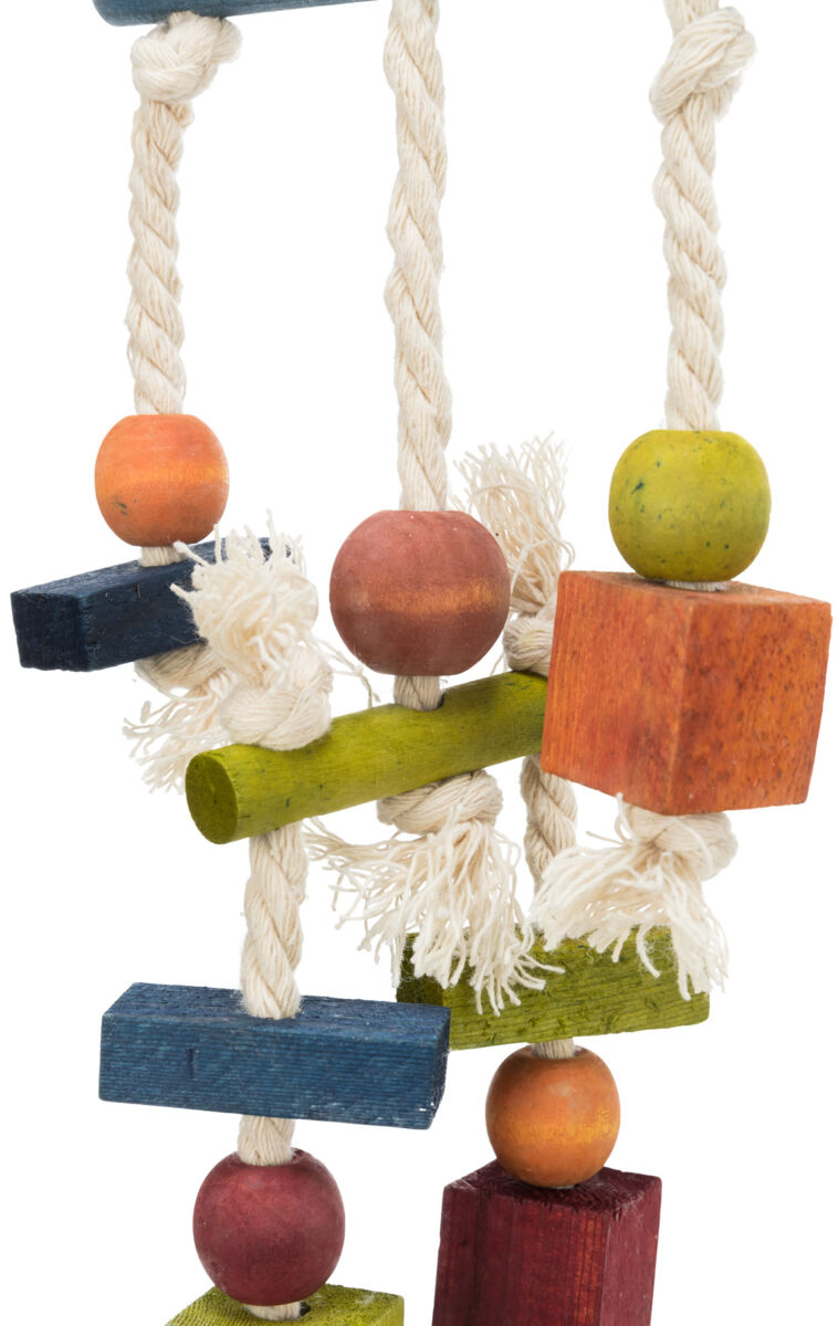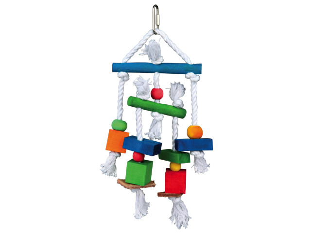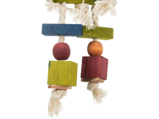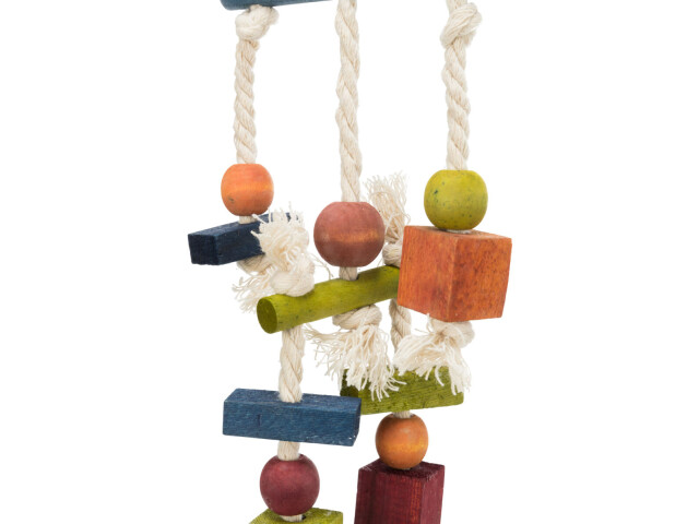 Jucarie din lemn pe franghie, cu bucati din piele. Jucaria este colorata. Dimensiuni: 24 cm Potrivita pentru pasari ca de exemplu: nimfe, perusi.