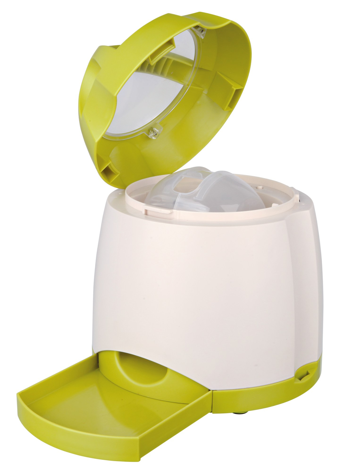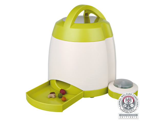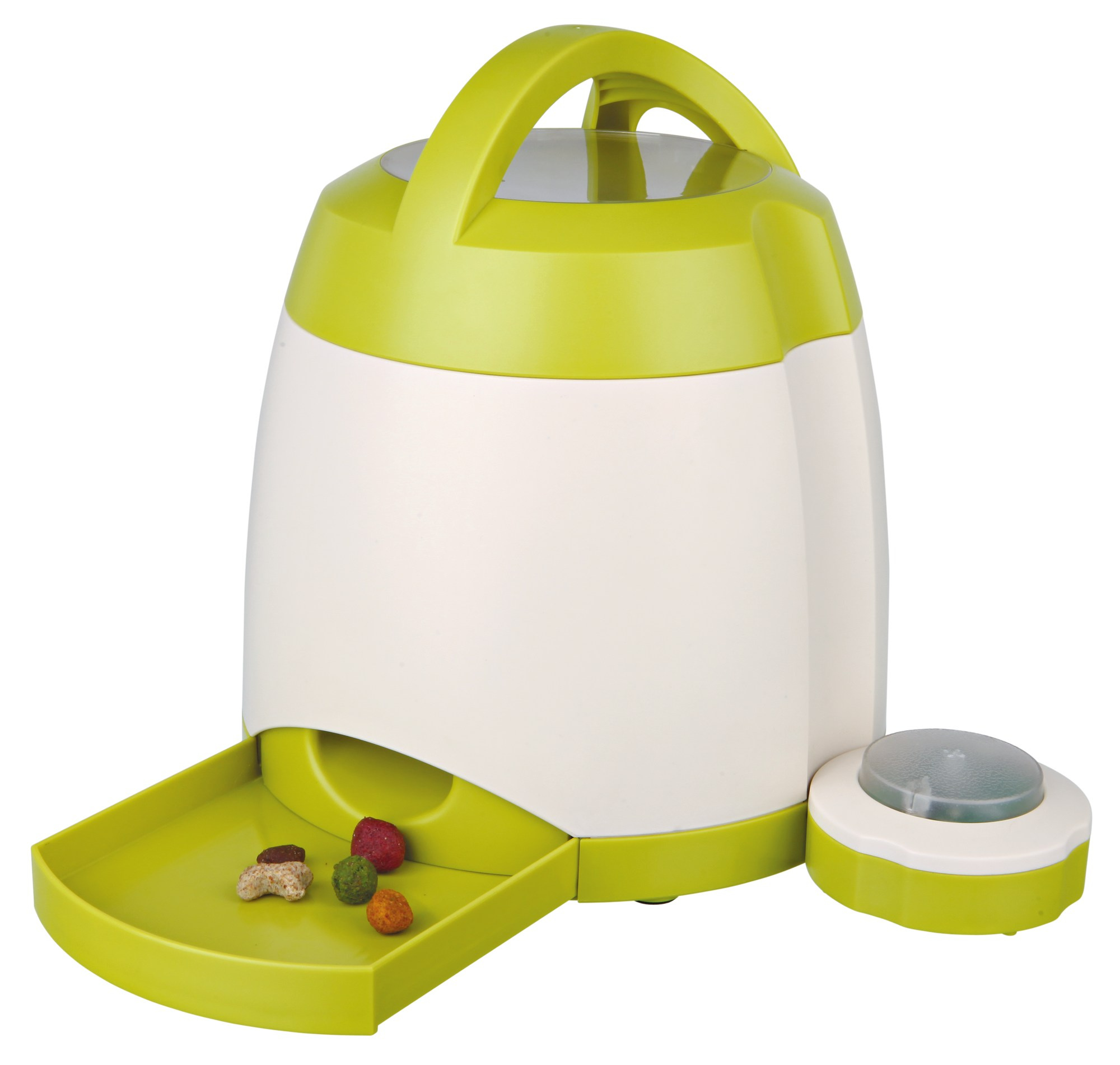 Hranitor automat inovativ: exercitii distractive pentru stimulare mentala si fizica. Are nivele diferite de dificultate prin declansator separat la distanta de pana la 40 metri. Cu baterii. O provocare pentru trup si minte. Trixie Dog Activity Memory Trainer e un joc stimulat de antrenare a mintii prin care cainele poate castiga recompense delicioase. Atunci cand animalul apasa cu labuta pe butonul declansator, distribuitorul va elibera un snack si astfel cainele va fi incurajat sa se joace iar si iar cu aceasta jucarie. Distribuitorul are baza antialunecare, e fabricat din plastic robust si poate fi umplut cu snackuri sau cu hrana uscata obisnuita a cainelui. Pentru a regla dozajul, puteti seta marimea deschiderii dupa cum este nevoie. Declansatorul este un buton mare pe care cainele poate apasa cu labuta. Pe masura ce cainele progreseaza, el poate fi pozitionat din ce in ce mai departe de distribuitor. Distanta maxima este de 40 de metri, astfel ca veti avea multe posibilitati pentru a va provoca cainele. Distribuitorul si declansatorul pot fi plasate in camere diferite pentru a-i oferi cainelui o ocupatie interesanta. Cum functioneaza jucaria Trixie Dog Activity Memory Trainer: Prima provocare la care trebuie sa faca fata cainele este sa isi dea seama ca exista o legatura intre distribuitor si declansator. De fiecare data cand va apasa pe buton, va auzi un sunet si va invata repede ca acel ton inseamna ca il asteapta o gustare in bolul distribuitorului. Daca aveti doi caini, puteti selecta cate un sunet diferit pentru fiecare pentru a-i dresa individual. Odata ce cainele a invatat sa faca legatura intre distribuitor si declansator, il veti putea pozitiona mereu in locuri diferite si la distanta din ce in ce mai mare pentru a creste dificultatea. Declansatorul poate fi fixat ferm pe suprafete netede datorita suportului de plastic, pentru sticla exista o ventuza, iar pentru fixare pe iarba sau pietris e inclusa o ancora stabila. Pentru a va invata cainele cu succes si distractie maxima, este inclus un manual de instructiuni. Aici sunt descrise detaliat diverse etape de invatare si mai multe optiuni pentru familiarizarea cu jucaria Trixie Dog Activity Memory Trainer si un dresaj cu rezultate bune. Prezentare pe scurt a jucariei Trixie Dog Activity Memory Trainer: Jucarie interactiva si stimulanta pentru antrenarea mintii cainelui, cu mai multe nivele de dificultate Pentru snackurile sau hrana uscata obisnuita a animalului dumneavoastra Distribuitor automat de hrana cu diverse nivel de dificultate: cainele va fi recompensat cu cate un snack din recipientul distribuitorului cand apasa pe butonul declansatorului. Pentru o joaca variata, declansatorul poate fi pozitionat la pana 40 de metri departare de distribuitor. Diverse optiuni de fixare a temporizatorului: prin suportul de ancorare, veti putea fixa dispozitivul in iarba sau pietris, iar ventuza poate fi folosita pentru o fixare ferma pe sticla si alte suprafete netede. Veti primi si un suport aditional cauciucat pentru o buna stabilitate a declansatorului. Dozaj manual al continutului de snackuri datorita deschiderii ajustabile din recipient Cu cupa practica pentru umplerea recipientului de hrana Baza cauciucata anialunecare Cu instructiuni, recomandari si sfaturi pentru un dresaj optim Functioneaza cu baterii: 3x AAA Micro si 4x C Baby – nu sunt incluse la livrare! Dimensiuni: Distribuitor: Ø 20 x i 24 cm.