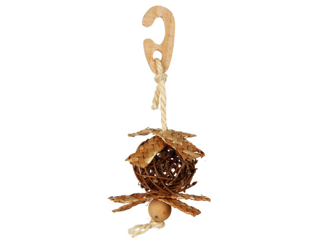 Informatii despre produs: Jucarie cu carlig de lemn si panglici de paie. Realizata din materiale 100% naturale. Dimensiuni: 5,5×15 cm. Jucarie destinata pentru pasari ca de ex.: canari, perusi.