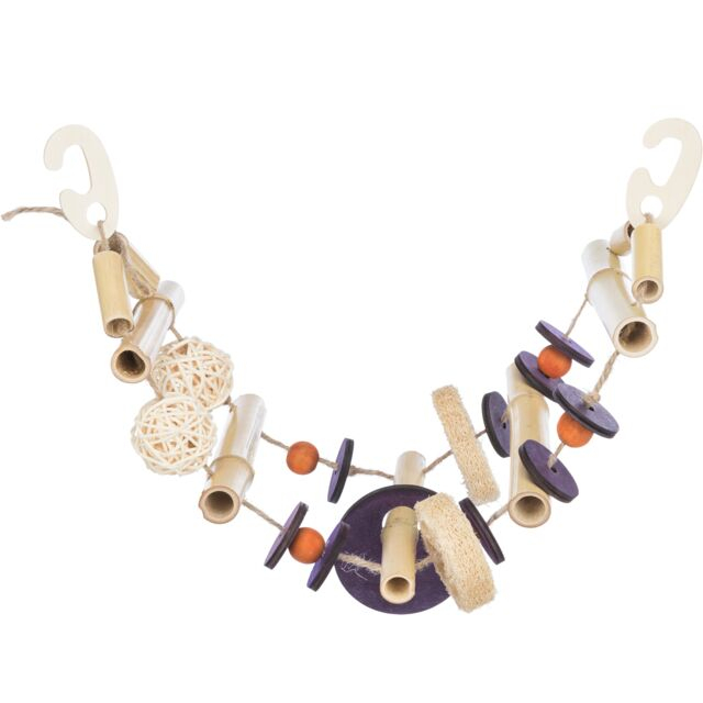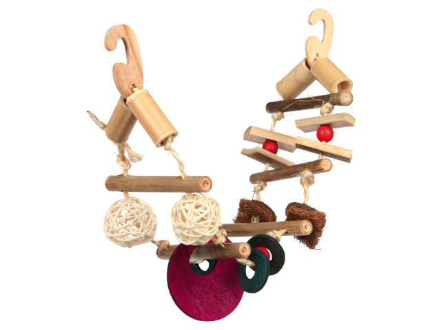 Jucarie potrivita pentru pasari ca de exemplu: nimfe, perusi. Cu carlig de lemn.Realizat din materiale 100% naturale.Materiale: bambus, nuca de cocos, ratan, lemn si funie de sisal.