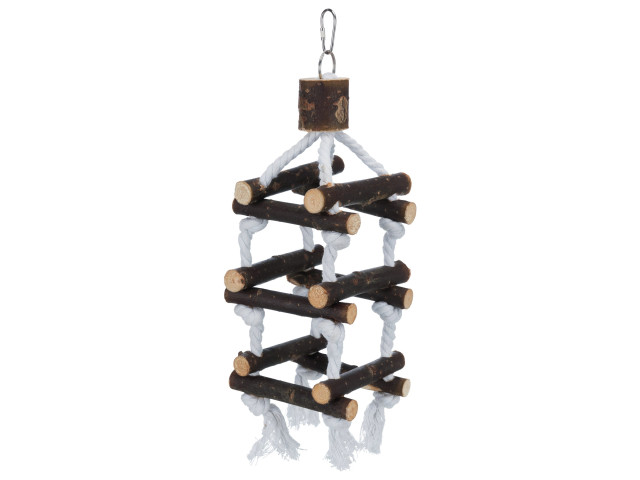 Jucarie turn cu franghie pentru pasari. Material: lemn de scoarta. Dimensiuni: 34 cm. Potrivita pentru pasari ca de exemplu: canari, perusi.