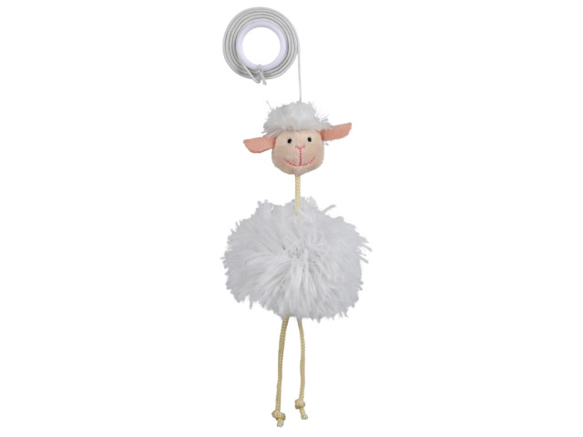 Jucarie oaie pe o banda elastica. Material: plus (poliester) Cu clopotel. Dimensiune: 20 cm