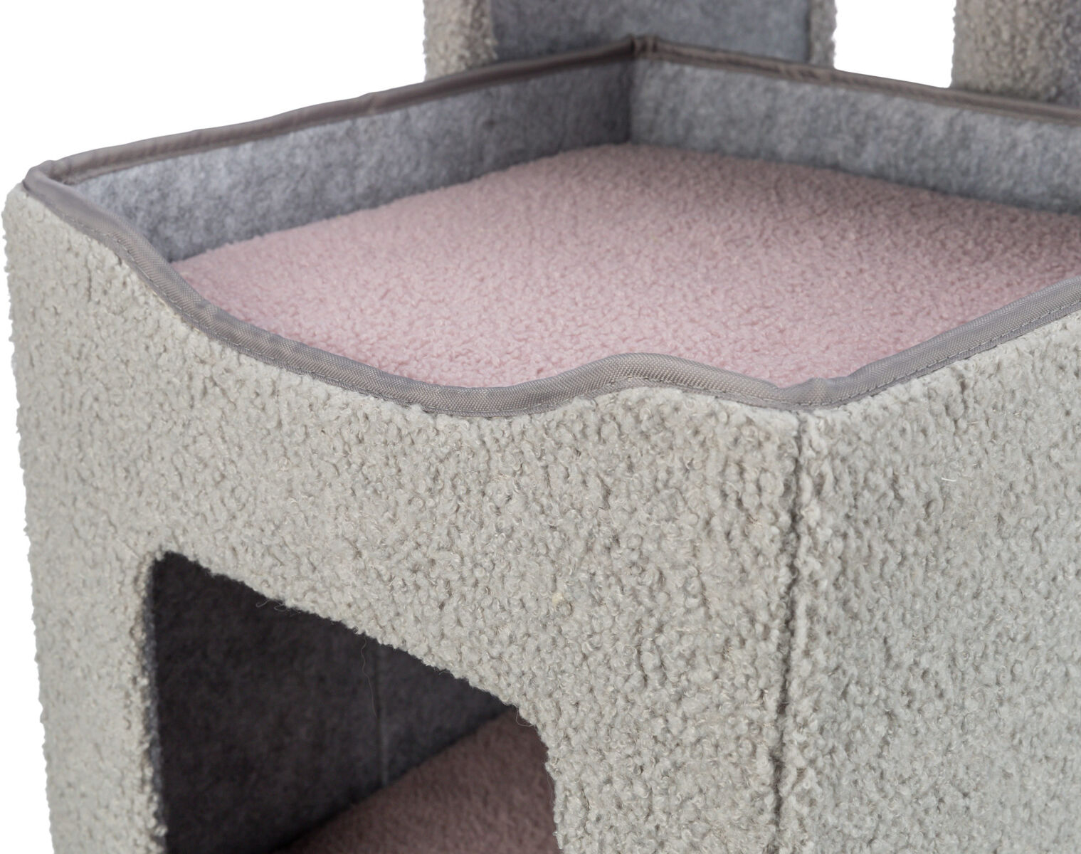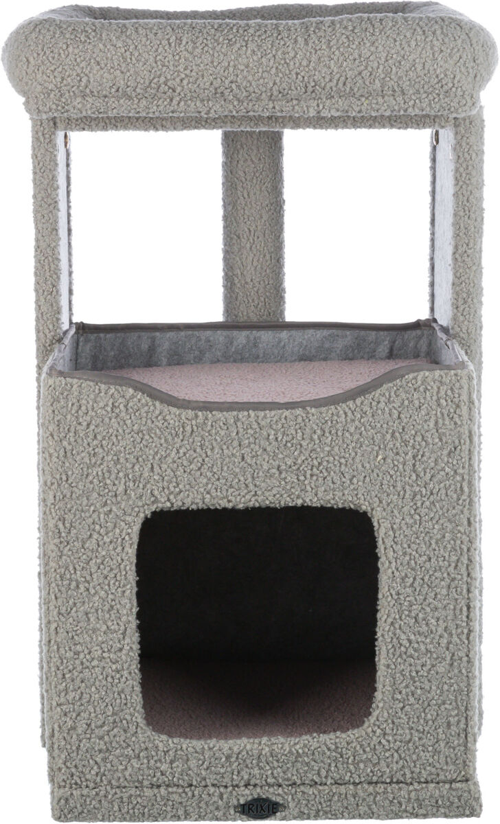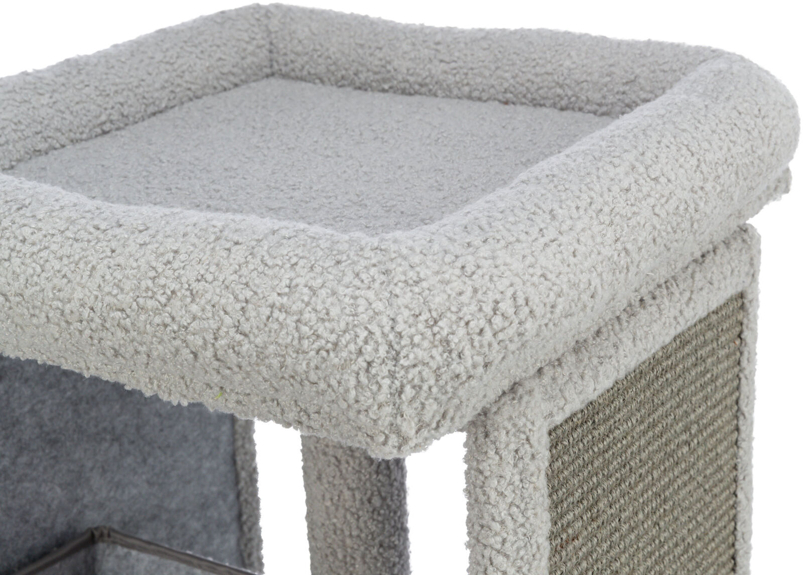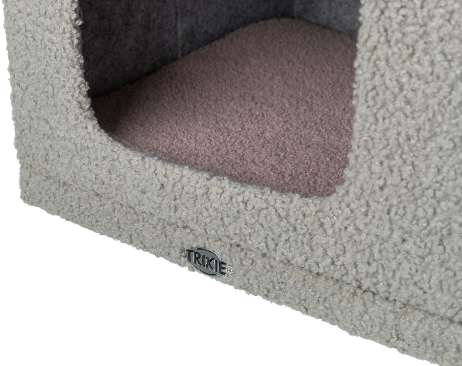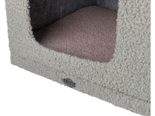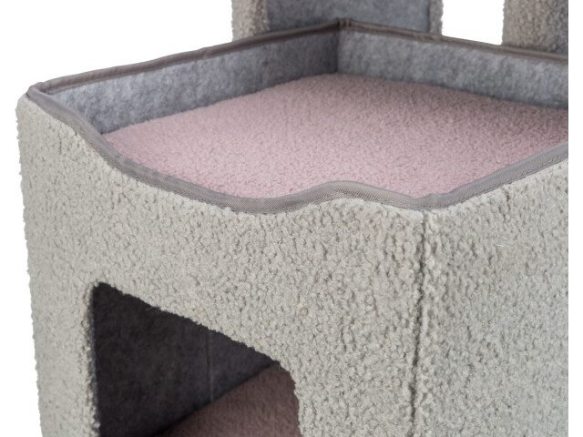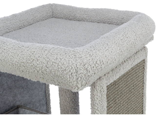 Informatii despre produs Material: plus sisal/plus (poliester): 270 g/m² Pestera cu suprafata de culcare captusita si covoras detasabil, reversibil: spalare manuala Pat dragalas cu platforma si margine captusita Culoare: gri/lila Suprafata podea: 38 × 49 cm, inaltime: 63 cm