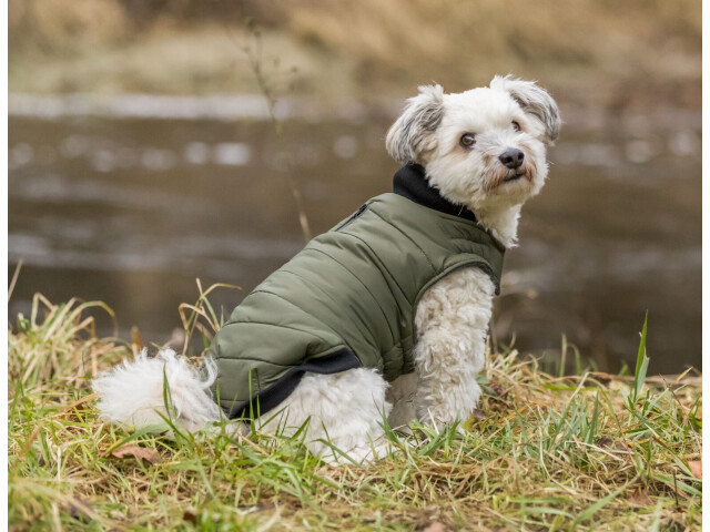 Informatii despre produs: Material: poliester. – cu captuseala din lana. – impermeabila. – poate fi combinat cu ham. Marime:S. Circumferinta abdomenului: 50 cm Lungime spate: 36 cm Circumferinta gat: 40-46 cm Culoare: kaki