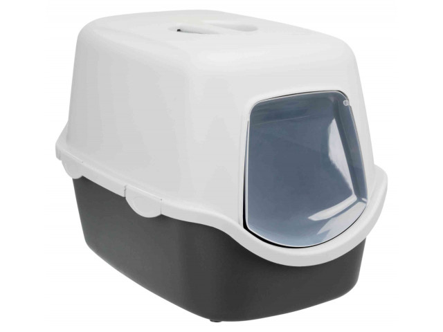 Litiera acoperita este o toaleta care ii ofera pisicutei intimitate si minimalizeaza raspandirea mirosului neplacut. Baza inalta impiedica urina si asternutul sa fie imprastiate din tava. Usita rabatabila din plastic transparent.