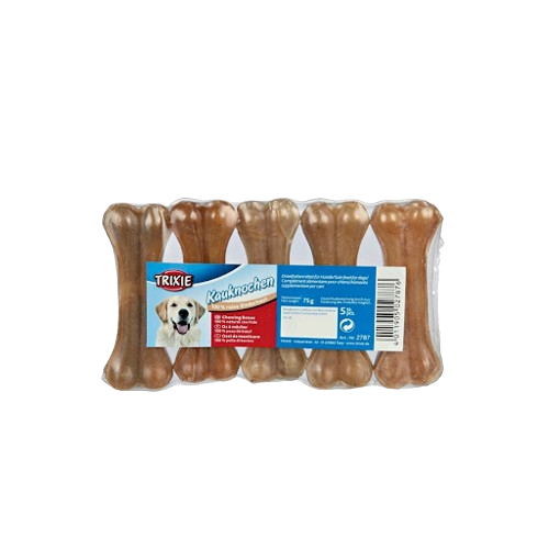 Os din piele uscata ideal pentru ros. Contribuie la curatarea dintilor si intareste gingiile, dintii si maxilarul. Dimensiuni: 8 cm Continut / Greutate: 5×15 g Recompensa de mestecat sub forma de os presat pentru caini este un produs delicios si sanatos, ideal pentru a satisface instinctul natural mestecat al catelului. Aceasta este fabricata din 100% piele bruta uscata, ceea ce ii confera o textura robusta si un gust atragator. Caracteristici principale: Compozitie naturala: Fara aditivi sau conservanti, acest os presat este creat doar din piele bruta de calitate superioara, oferind o gustare sanatoasa si naturala. Beneficii pentru dantura: Mestecarea acestui os ajuta la curatarea dintilor si la mentinerea sanatatii gingiilor, reducand formarea placii bacteriene si a tartrului. Durabilitate: Forma si consistenta sa confera o durabilitate mare, permitand cainilor sa se bucure de el pe o perioada indelungata, ceea ce il face un companion perfect in timpul liber. Satisfactie si stimulare: Recompensa este ideala pentru a-i oferi cainelui o activitate de mestecare care ii va ocupa timpul, reducand astfel comportamentele distrugatoare si stresul. Atractivitate: Cainii sunt atrasi de mirosul si gustul natural al pielii, astfel incat osul presat devine rapid o recompensa preferata. Aceasta recompensa de mestecat este ideala pentru cainii de toate dimensiunile si rasele, avand grija sa alegi dimensiunea potrivita pentru cainele tau. Este o alegere excelenta pentru antrenamente, rasfaturi ocazionale sau pur si simplu pentru a face cainele fericit!