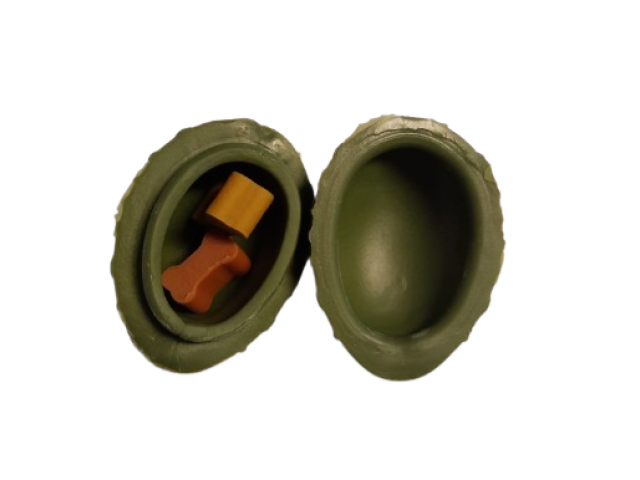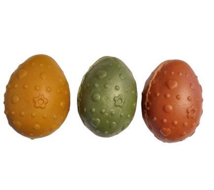 Oua de paste cu recompense in interior. Oul este din acelasi material si compozitie ca recompensa din interior. Compozitie: amidon de cartofi, carne de pui (16%), amidon de tapioca, faina de orez, glicerina, minerale, pulbere de celuloza, spanac, pulbere de galbenus de ou | formula fara gluten | fara zahar adaugat Atentie!!! Pachetul contine 3 bucati!