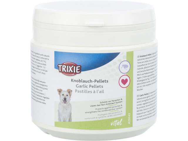 Supliment alimentar cu usturoi sub forma de granule. Beneficii: – agenții activi naturali ai usturoiului creează pe pielea animalului un mediu pe care paraziții îl evită. – întărește sistemul cardiovascular. Compozitie: cereale, subproduse vegetale, usturoi (5 %), carne si subproduse de origine animala, peste si subproduse din peste, lapte si produse lactate, uleiuri si grasimi, minerale | A se pastra intr-un loc racoros si uscat. Componenta analitica: Calciu 1,5% Continut de grasime 4,5% Fosfor 0,7% Proteine 22,0% Cenusa bruta 7,1% Fibra bruta 4,6% Aditivi (nutritivi) Fier 37 mg Cupru 3,3 mg Mangan 43 mg Vit. A 25000 Vit. B1 30 mg Vit. B2 20 mg Vit. B6 15 mg Vit. C 60 mg Vit. E 125 mg Zinc 36 mg