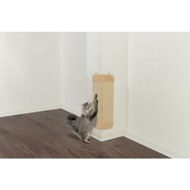 Scratching Board pentru colturi Material: sisal / plus (poliester) Partea din spate acoperita cu plus (poliester) Suprafata de sisal 14 × 47 cm Se poate agata Dimensiuni: 32 × 60 cm Culoare: maro / maro