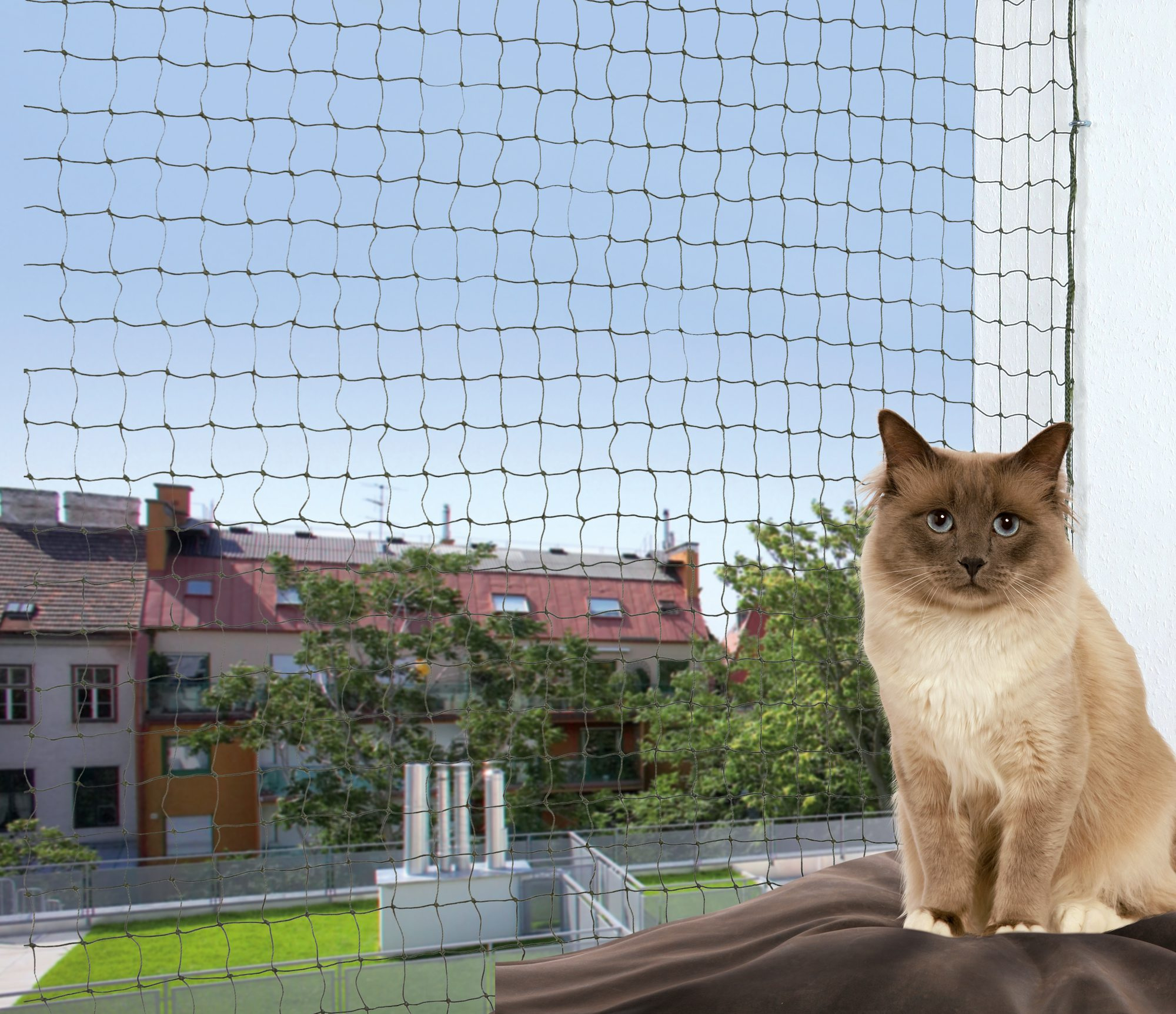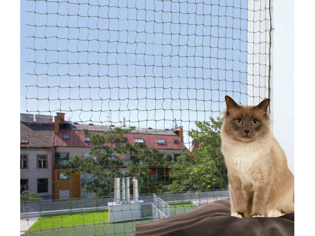 Plasa de protectie. Sarma tesuta o face rezistenta la muscaturi. Rezistenta la uzura si rezistenta la UV. Pentru uz interior si exterior. Latime plasa 3×3 cm. De asemenea, potrivita pentru pisici mici. Cu carlige, dopuri de prindere si snur de fixare. Material: nailon. Masuratori: 8×3 m. Culoare: verde masliniu.