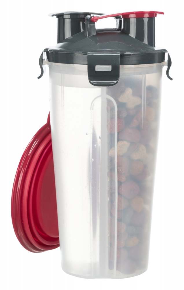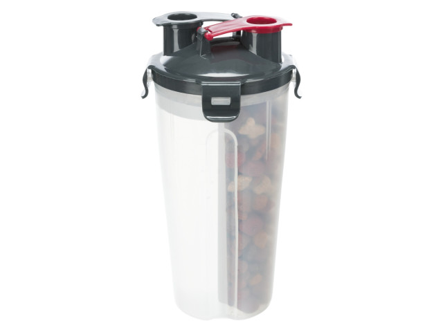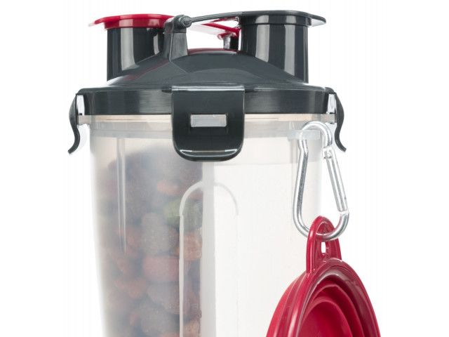 Recipient de stocare pentru hrana si apa 2 compartimente separate cu capac impermeabil 2 deschideri cu capac pentru utilizarea separata a compartimentelor Cu carabiniera si cu castron din silicon Material: plastic / silicon Masuratori: 2×0,35 l / 11×23 cm